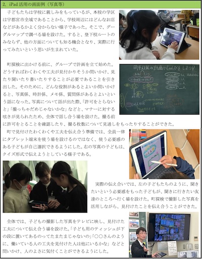 繰り返し探検に出掛け、附属小周辺、さらには自分の住んでいる地域にも愛着をもてるようにするために、タブレット端末を効果的に使い、単元の目標に迫った。見付けた学校周辺のよさに関する○○ナンバー1や働いている人に関する○○メダリストをタブレット端末でまとめたこと伝え合ったり、利用者の一人である保護者から見た附属小周辺のよさについての動画を見聞きしたりすることができる環境を設定し、新たな気付きが生まれるようにした。