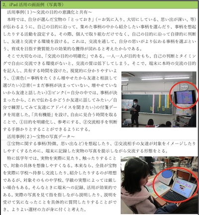 本単元では、「伝えたいことが伝わるように、話す事柄を選ぶ⼒」(話す・聞くア)の育成を主に図った授業実践である。「とっておきの宝物を友達へ紹介する」という単元全体の⾔語活動を設定し、効果的な資質能⼒の育成を図るため、主に交流の場⾯での ICT 活⽤を取り⼊れた。
