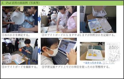 ① 2年⽣の給⾷(⾷⽸内の汁物)の量がどれくらいかを表す際に、どの単位を使い、どのような順序でいくつ分として量ったのかを学習⽀援アプリを活⽤し、共通のワークシートに整理できるようにした。