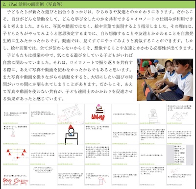 子どもにとって身近な動物を扱い、動物の形や色などの特徴を組み合わせて新しい動物を想像し、絵に表していく授業。導入では、グループで学習支援アプリ(ロイロノート)を用いて、グループの友達と「がっちゃんこどうぶつ」を表していく活動を行った。また、グループの友達と考えた動物をモニターに映し出し、全体で取り上げて共有を図った。また、自分の「がっちゃんこどうぶつ」を考える際にも、必要に応じてタブレット端末を使って考えることができるようにした。授業の終末では、タブレット端末を使って、子どもの作品をモニターに映し出し、互いのよさを共有できるようにした。