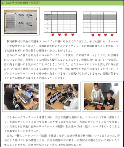 ワークシートはすべて、ロイロノートにて配付。端末を通してワークシートに記入し、ロイロノートで提出。思いを表現するための自分の動機の創作、動機のつなげ方の工夫、動機の変化のさせ方の工夫とスモールステップで学習を進めていくことで、全員が曲作りを完成させることができた。最終的に、できあがった曲は端末内GarageBandのキーボードで演奏し、画面収録をして提出。そのため、記譜はすべて事前に紙面で残す必要があった。(ロイロノートで提出した自作楽譜は印刷して配付)できあがった曲は回答共有し、お互いに聴き合いよさを伝え合った。