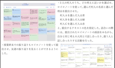 ある村で⽯橋の建設をするために集められた 3 ⼈の村⼈それぞれの考えを聞かせ、もしも⾃分がその場にいるとしたら、 3 ⼈の考えの中で、どの考えに近いかを選ばせた。その後、 ロイロノートを使って、選んだ村⼈の名前と選んだ理由を提出させた。その際に、村⼈Aを選んだ⼈は⻘、村⼈Bを選んだ⼈は緑、村⼈Cを選んだ⼈は⾚のように、提出するテキストの⾊を指定した。