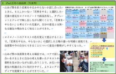 自分はこれからどのように伝統を受け継ぐのか、山あげ祭の在り方をどのように改善していけばいいのか、今の自分にできることはなにか、自分の考えとその理由をロイロノートにまとめて共有することで、多面的な見方をしたり、級友の意見と比較したりして意思決定することができるようにした。