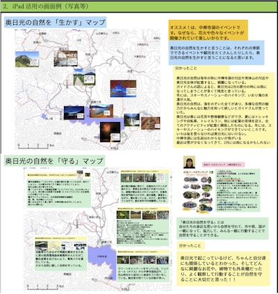 様々な⼈々や関係機関が奥⽇光の⾃然を⽣かしてきたことを調べて「奥⽇光の⾃然を『⽣かす』マップ」にまとめたり、守ってきたことを調べて「奥⽇光の⾃然を『守る』マップ」にまとめたりしてきた。それらを⽣かして、様々な⽴場や観点に着⽬して、どうすれば奥⽇光に宿泊する観光客を増やすことができるかを「奥⽇光宿泊プラン」に表現し、よりよいプランにするために、話し合う活動を設けた。