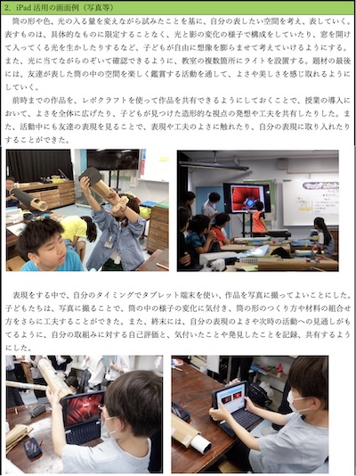 活動中や振り返りにおいて、レポクラフト(評価アプリ)を活⽤し、その時間の作品を写真に撮って蓄積し、導⼊や終末で取り上げて、互いの思いの実現に向かって表現を深めていけるようにした。