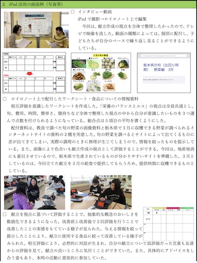 外国人旅行客に栃木県の魅力を知ってもらうための“Wonderful Tochigi Video”の内容を考える際、ロイロノート上の絵カードに自分の声で文を録音し、蓄積した「センテンスカード」を使う。目的や場面、状況などに応じて、子どもが作成したセンテンスカードを共有したり、学習支援アプリ上で順番を換えたりするときにiPadを活用した。また、授業の最後に自分の話す様子を撮影し、その動画を見ながら振り返りをする場を設けることで、課題や成果を捉えることができるようにした。
