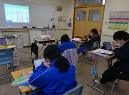 2月13日(木)。群大附属特支の中学部3年と本校の中学部3年生が、Zoomを通して交流をしました。互いに修学旅行の発表をしたり質問をしたりしました。互いの発表に興味津々の様子でした。