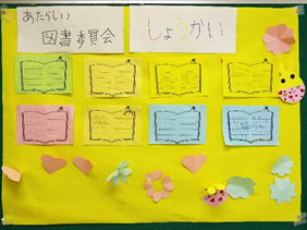 今年度から毎週火曜日に図書ボランティアさんが来校し、本の修理をしたり、本の紹介コーナーや壁面掲示物を作ったりしてくださっています。